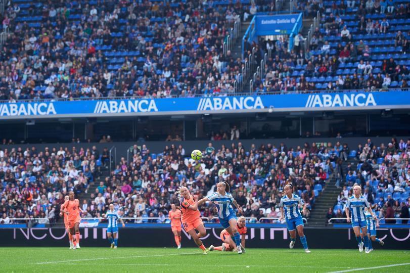 The Riazor stadium, which hosted 4,359 spectators, welcomed FC Barcelona. The first chance of the match fell to the *culé* side. A free-kick delivery from Sydney Schertenleib was headed by Irene Paredes from inside the box, but Inês Pereira flew across her goal to push the ball away and keep the score at nil. The second opportunity of the game was at the feet of Martine Fenger. The Norwegian player won a ball into space and once again came up against a formidable Portuguese goalkeeper, who prevented the goal with a sensational save. For their part, Deportivo Abanca held on thanks to the quality of Ainhoa Marín, but they were unable to trouble Gemma Font. The team from A Coruña went into half-time without conceding and weathering the *blaugranas*' attacks.
